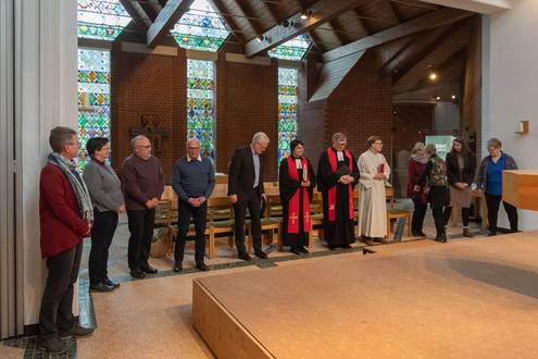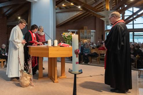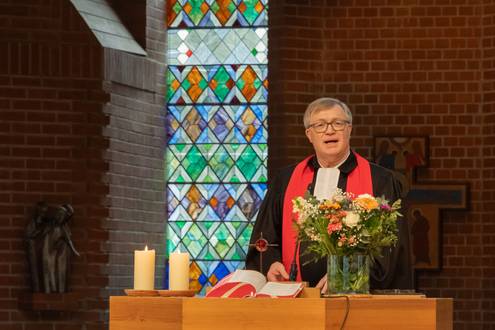 „Gelebte Einheit ist die Zukunft der christlichen Kirche.“ Mit einem nachdrücklichen Appell hat Pfarrer Thomas Lehmkühler sich im Rahmen eines ökumenischen Gottesdienstes am 15. Februar in den Ruhestand verabschiedet. Vor seiner Entpflichtung durch Dekanin Christiane Glöckner-Lang nutzte er seine letzte Predigt im Dienst, um noch einmal den Abschnitt im vierten Kapitel des Epheserbriefs auszulegen, dessen zentrale Worte auch ins Taufbecken der Arche eingraviert sind: „Ein Herr, ein Glaube, eine Taufe“. Thomas Lehmkühler betonte dabei, dass die Taufe auf und der Glaube an Jesus Christus eine Einheit begründen, die der kirchlichen Realität mit ihrer Vielzahl an Konfessionen immer schon vorausgeht: „Es ist wirklich nur ein Gott, der in den vielen Kirchen verehrt wird. Der lässt sich nicht teilen in evangelische, katholische, orthodoxe oder sonstige konfessionelle Anteile.“