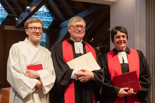 Die Dekanin würdigte seine berufliche Laufbahn, bei der vom Anfang bis zum Ende die Ökumene eine zentrale Rolle spielte. Dabei griff sie Psalm 31 auf: „Du stellst meine Füße auf weiten Raum.“ Auf weiten Räumen sei Thomas Lehmkühler 40 Jahre lang dem Ruf seiner Kirche gefolgt, dorthin wo Gott ihn gesandt habe. Berufliche Stationen auf diesem Weg waren neben der Arche bspw. auch die ökumenischen Zentren in Stegen und Neckar-Elz. Zusammen mit Regina Meyer als Vorsitzender des Öku-Rats und Pastoralreferent Tobias Bartole sprach die Dekanin dem scheidenden Pfarrer den Segen für den Übergang in den Ruhestand zu.